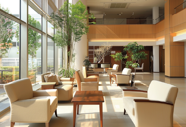 利用者様にとって「もうひとつの我が家」となるような、温かみのある空間づくりを心がけています。四季の移ろいを感じられる中庭や、木のぬくもりを感じる内装が特徴です。